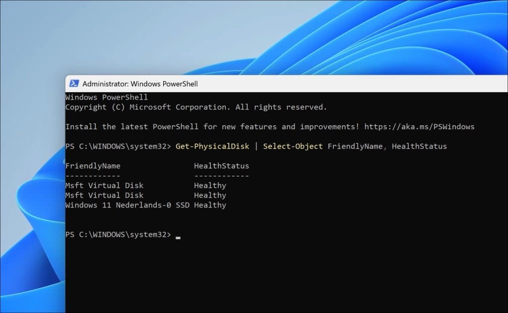 Get-PhysicalDisk | Select-Object FriendlyName, HealthStatus